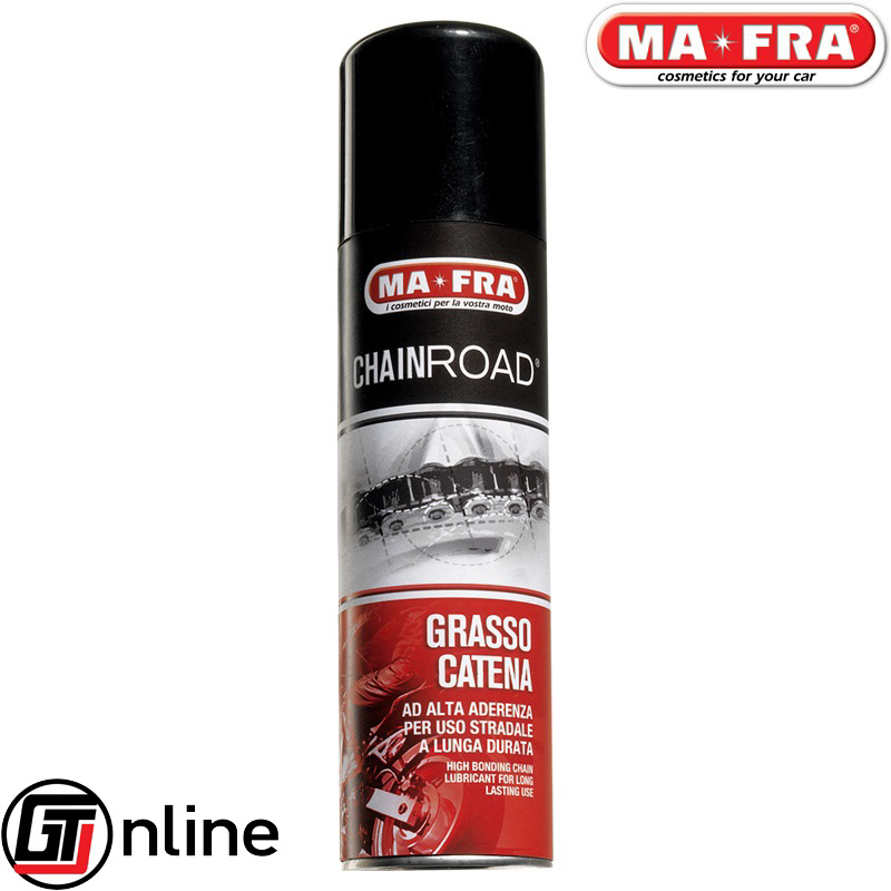 اسپری روان کننده و تمیز کننده زنجیر موتور سیکلت از برند مفرا ایتالیا می باشد. این روان کننده با خصوصیات تخصصی بنام تجاری Chain Road در حجم 250 میلی لیتر در بازار ارایه می شود. این محصول Mafra برای روان نمودن حرکت زنجیر موتور سیکلت با قدرت تمیز کنندگی و با قابلیت تحمل حرارت بالا و عدم خشک شدن و ایجاد لکه روی بدنه از محصولات تخصصی موتور سواران می باشد. رنگ نارنجی این محصول مفرا باعث سهولت در رویت آن میشود و موتور سوار به راحتی میزان مانده مواد را روی زنجیر موتور تشخیص میدهد.